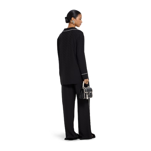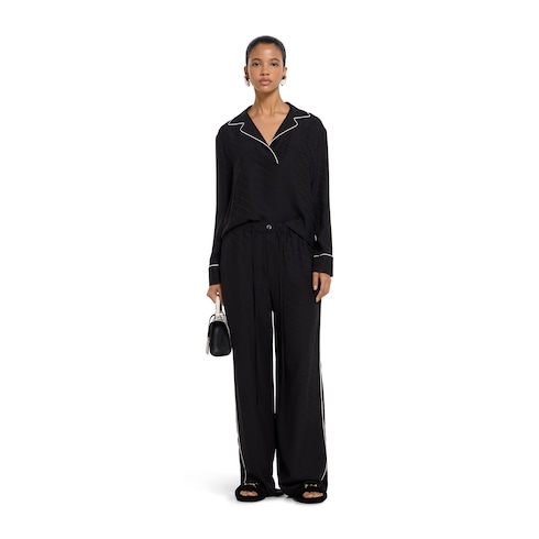 La collection de prêt-à-porter pour femme Cruise 2026 rend hommage à la garde-robe Gucci à travers un mélange ludique d’influences d’archives et de l’histoire de Florence, oscillant entre minimalisme et maximalisme. Ce t-shirt à manches longues est confectionné en jacquard de soie à détail Mors noir agrémenté d’un passepoil blanc.