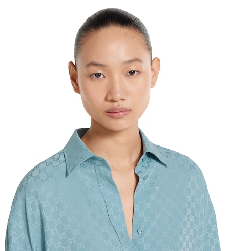 La collection Pre-Fall 2025 associe à la perfection textures variées et détails sophistiqués. Le tissage en jacquard et les broderies raffinées évoluent au fil des saisons. Cette chemise oversize est confectionnée dans un élégant jacquard de soie GG.
