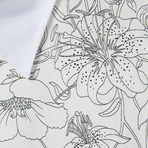L’imprimé Flora issu des archives des années 60 prend vie sur les pièces de prêt-à-porter, explorant les teintes fraîches et les dégradés de la collection Pre-Fall 2025 avec une touche romantique. Une version délavée du motif orne cette chemise intemporelle.