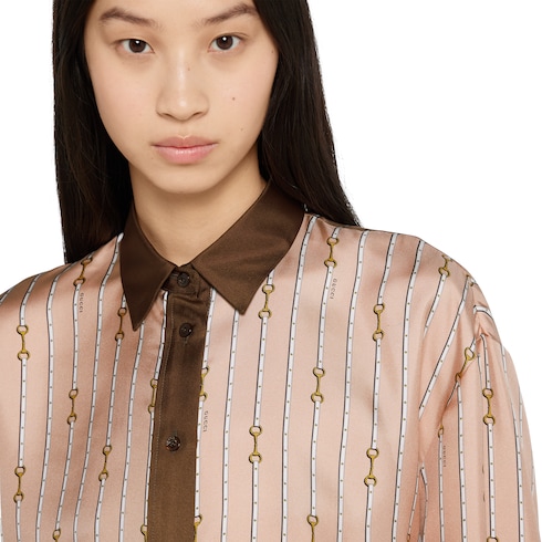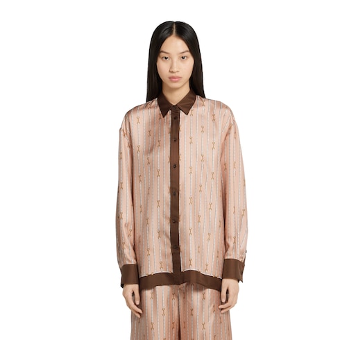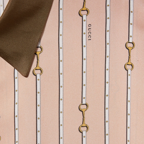 Pour la collection Pre-Fall 2025, des couleurs vives et des imprimés envoûtants confèrent aux looks de prêt-à-porter une touche d’audace pour la garde-robe de mi-saison. Cette chemise en twill de soie se caractérise par un imprimé ceinture Mors Gucci sur toute la surface.