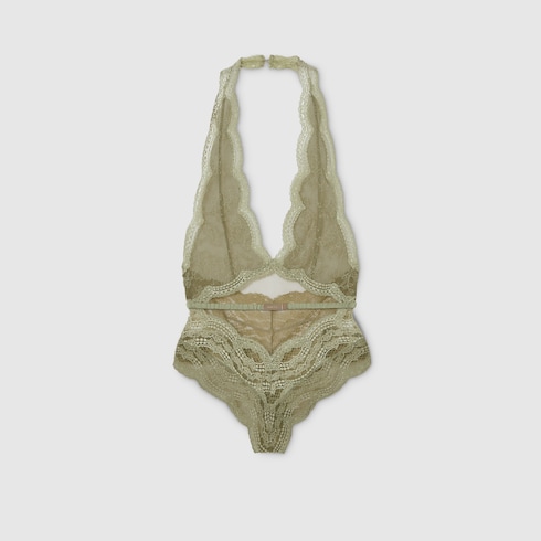 Pour la collection Automne-Hiver 2025, ce body est confectionné en tulle stretch à dentelle fleurie vert. Caractérisé par un profond décolleté en V, ce modèle est complété par une ceinture élastique froncée agrémentée d’une boucle Gucci en métal.