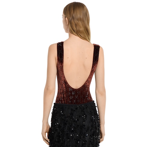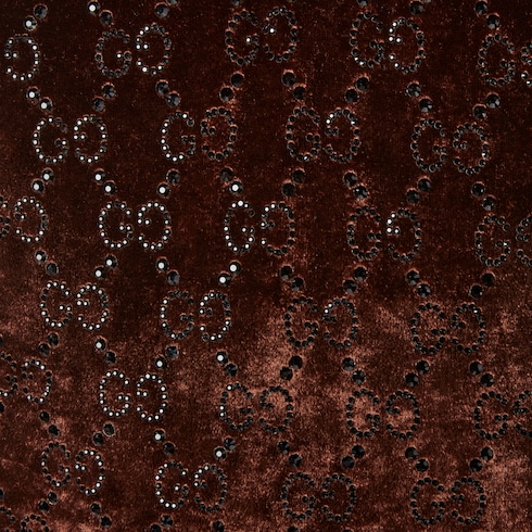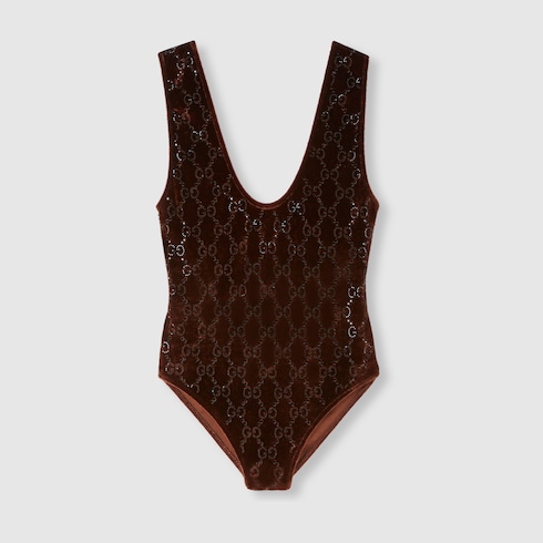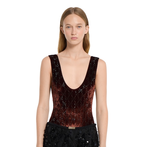 Pour la collection Automne-Hiver 2025, le body en chenille stretch s’illumine d’un éclat nouveau. Le modèle est orné d’une broderie en cristaux GG sur toute la surface et d’une encolure échancrée sur l’avant et à l’arrière.