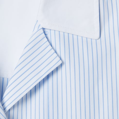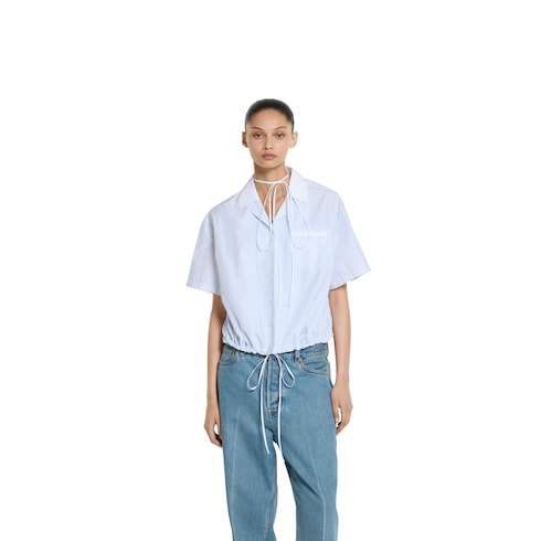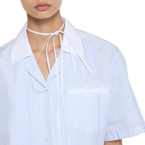 Parfaites pour le bord de mer, les créations d’inspiration marine rehaussent les silhouettes décontractées de rayures et de motifs signature au sein de la collection Pre-Fall 2025. Le logo Gucci apparaît de façon subtile sur le tissu en fil de coton coupé à rayures qui caractérise cette chemise à manches courtes avec ruban à nouer.