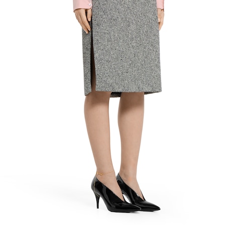 Pour la collection Automne-Hiver 2025, incarnation audacieuse de la féminité, ces mules à talon pour femme sont présentées en cuir verni brillant avec un élégant bout pointu. La silhouette épurée dégage une impression de raffinement contemporain, associant des touches rétro à une élégance moderne.