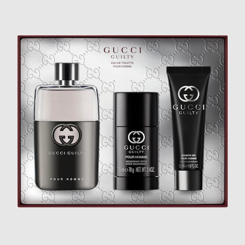 L'Eau de Toilette Gucci Guilty Pour Homme è una fragranza aromatica legnosa e speziata. Una vivace esplosione di Limone e note di Pepe rosa, dall'aroma intenso e speziato, conduce a un cuore di Lavandino e Assoluta di Fiore d'arancio. Alla base, il Patchouli si rivela nelle sue sfumature legnose dalle note di cuoio. In questo set regalo da tre pezzi, la fragranza è declinata come Eau de Toilette, gel doccia e deodorante stick.