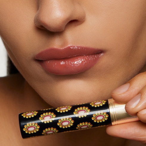 Rouge De Beauté Brillant coniuga le caratteristiche di un rossetto con quelle di un balsamo per labbra, offrendo colore intenso e idratazione profonda. La sua formula rilascia un sottile strato di colore brillante e luminoso, con un livello di pigmentazione a metà fra un rossetto semitrasparente e uno satinato, mentre mantiene le labbra idratate fino a 24 ore. Formulato con ingredienti nutrienti e antiossidanti, la sua consistenza cremosa esalta e conserva la bellezza naturale delle labbra, che appaiono subito rimpolpate. Gucci Rouge De Beauté è presentato nella colorazione Valeria Rose, un'elegante sfumatura di rosa ideale per aggiungere un tocco romantico alle labbra.
