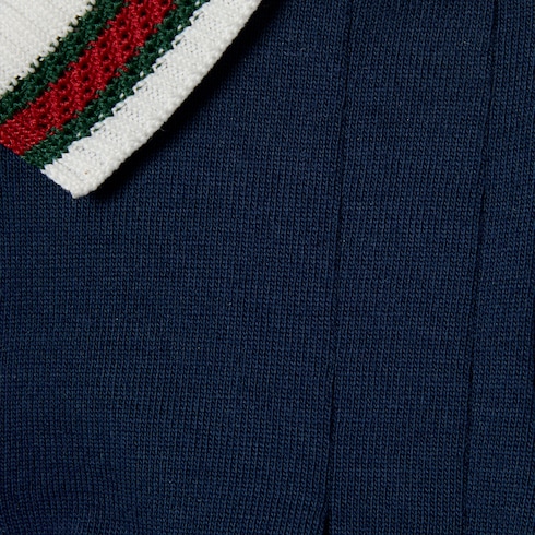 Il nastro Web d'archivio, proposto in numerose versioni e declinazioni, è presente in tutta la collezione bambini Pre-Fall 2025. Finiture in verde e rosso arricchiscono capi ready-to-wear, scarpe e accessori donando loro un carattere sportivo, perfetto per qualsiasi avventura. Questo abito per neonati è realizzato in jersey di cotone pesante e presenta un colletto modello polo in maglia con motivo Web.