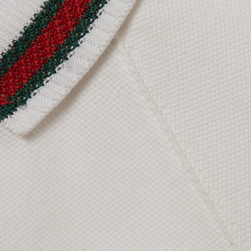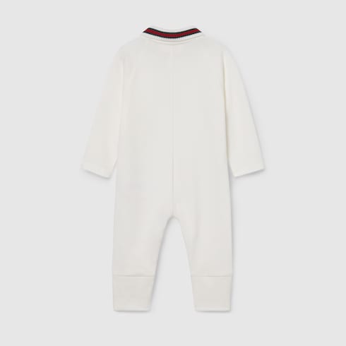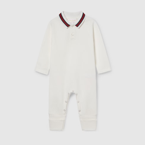 Il nastro Web d'archivio, proposto in numerose versioni e declinazioni, è presente in tutta la collezione bambini Pre-Fall 2025. Finiture in verde e rosso arricchiscono capi ready-to-wear, scarpe e accessori donando loro un carattere sportivo, perfetto per qualsiasi avventura. Questa tutina per neonati è realizzata in piquet di cotone stretch bianco e completata da finiture in maglia con motivo Web.