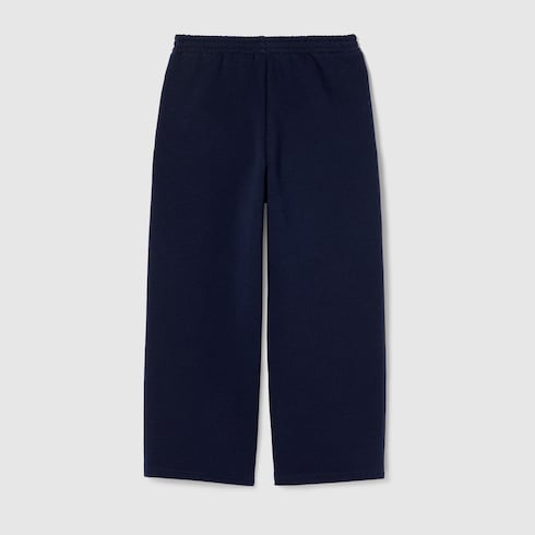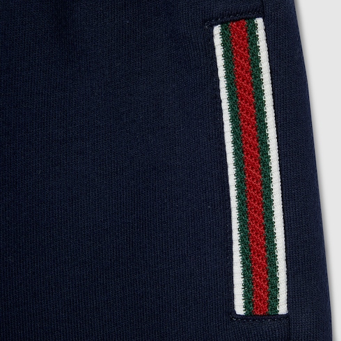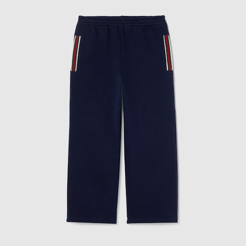 Il nastro Web d'archivio, proposto in numerose versioni e declinazioni, è presente in tutta la collezione bambini Pre-Fall 2025. Finiture in verde e rosso arricchiscono capi ready-to-wear, scarpe e accessori donando loro un carattere sportivo, perfetto per qualsiasi avventura. Questi pantaloni da jogging per bambini, realizzati in cotone felpato, sono definiti da un dettaglio Web in maglia.