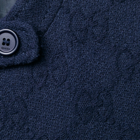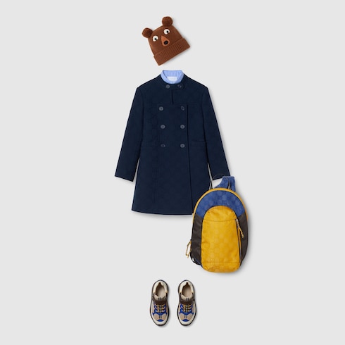 La collezione bambini Pre-Fall 2025 presenta una serie di motivi molto amati, tra cui gli inconfondibili dettagli con logo. Questo cappotto per bambini è realizzato in lana GG e rende omaggio all'inconfondibile monogramma della Maison.
