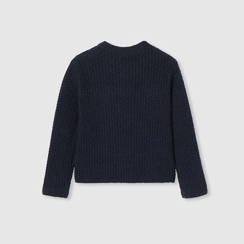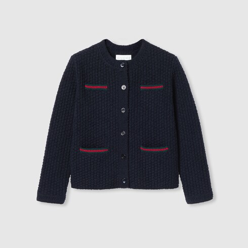 Il nastro Web d'archivio, proposto in numerose versioni e declinazioni, è presente in tutta la nuova collezione bambini. Finiture in verde e rosso arricchiscono capi ready-to-wear, scarpe e accessori donando loro un carattere sportivo, perfetto per qualsiasi avventura. Questo cardigan per bambini è realizzato in lana con finitura con motivo Web a contrasto sulle tasche.
