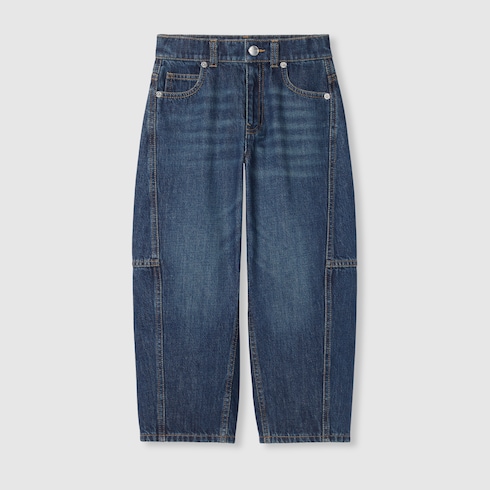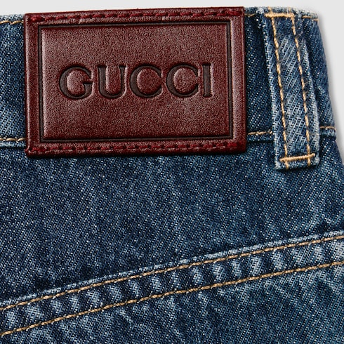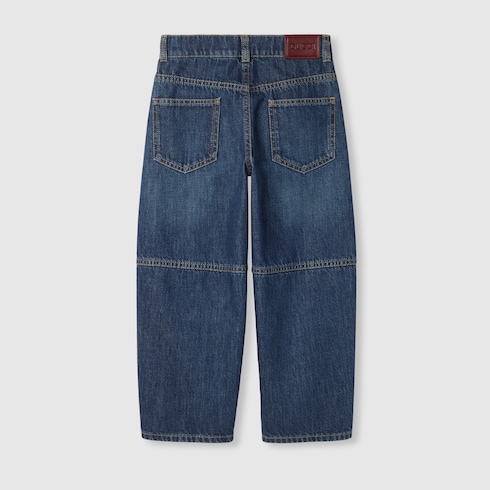 La collezione bambini Pre-Fall 2025 presenta una serie di motivi molto amati, tra cui gli inconfondibili dettagli con logo. Questi pantaloni in denim per bambini presentano un bottone in metallo Gucci e un'etichetta in pelle Gucci in rilievo.
