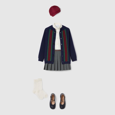 Il nastro Web d'archivio, proposto in numerose versioni e declinazioni, è presente in tutta la nuova collezione bambini. Finiture in verde e rosso arricchiscono capi ready-to-wear, scarpe e accessori donando loro un carattere sportivo, perfetto per qualsiasi avventura. Questa gonna per bambini è realizzata in lana con dettaglio Web ricamato in vita.