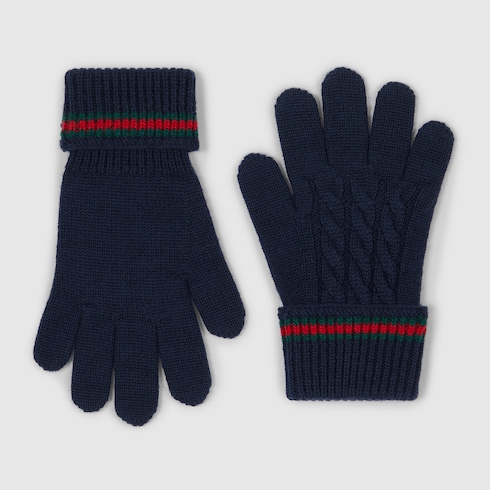 Il nastro Web d'archivio, proposto in numerose versioni e declinazioni, è presente in tutta la nuova collezione bambini. Finiture in verde e rosso arricchiscono capi ready-to-wear, scarpe e accessori donando loro un carattere sportivo, perfetto per qualsiasi avventura. Questi guanti per bambini sono realizzati in lana con una finitura con motivo Web a contrasto.