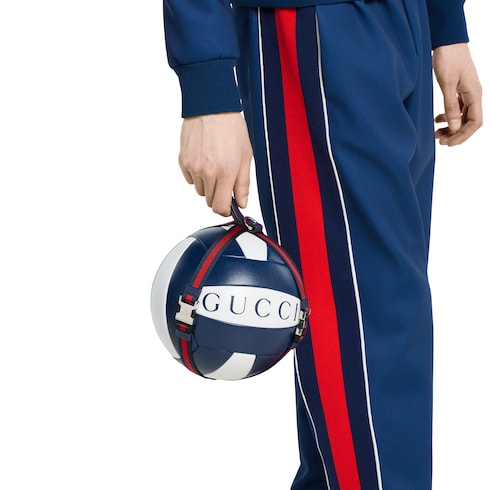 Questo pallone da pallavolo fa parte della collezione Pre-Fall 2025: realizzato in materiale bicolore e caratterizzato da una stampa àncora Gucci al centro, è dotato di una pratica cinghia per il trasporto in pelle e tessuto Web.