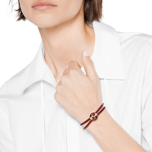 Parte della linea di gioielli fashion della collezione Pre-Fall 2025, i bracciali in pelle presentano una silhouette tubolare impreziosita da un dettaglio smaltato tono su tono con Incrocio GG Tondo inciso. I dettagli color oro e la chiusura scorrevole regolabile completano il design. Questa variante è realizzata in pelle Rosso Ancora.