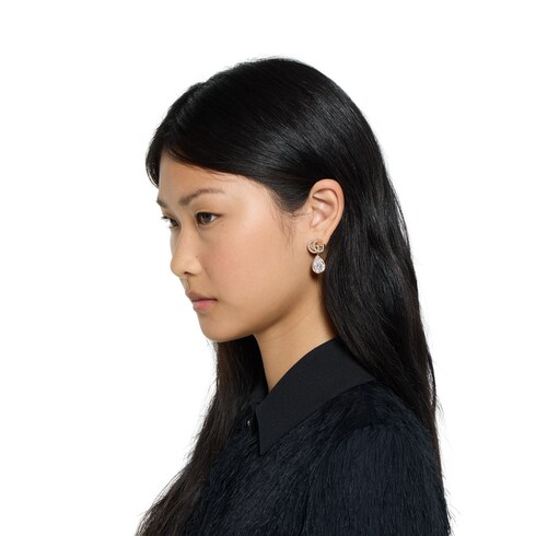 I gioielli fashion della Maison continuano a reinterpretare i motivi emblematici con materiali pregiati, una lavorazione artigianale elaborata e tonalità fresche, come nel caso di questi orecchini GG Marmont con cristalli.