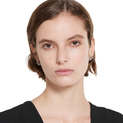 Emblema distintivo della Maison, le iniziali del Fondatore Guccio Gucci definiscono questi gioielli fashion. La Doppia G è impreziosita da cristalli, aggiungendo un tocco di luce al design di questi orecchini a lobo.
