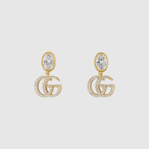 I gioielli fashion della Maison continuano a reinterpretare i motivi emblematici con materiali pregiati, una lavorazione artigianale elaborata e tonalità fresche, come nel caso di questi orecchini GG Marmont con cristalli.