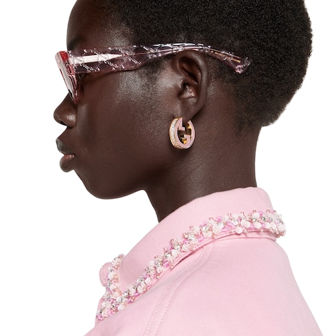 L'Incrocio GG Tondo, che definisce la linea Gucci Blondie, è impreziosito da cristalli taglio baguette e smalto rosa per la collezione Pre-Fall 2025. Il motivo cut-out forma un elegante pendente od orecchini di varie dimensioni.