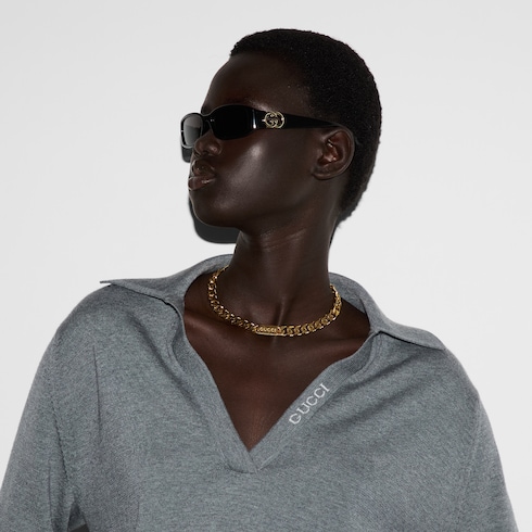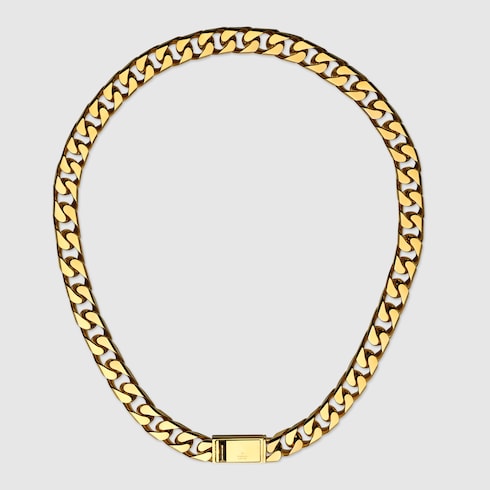 L'esclusiva linea di gioielli con scritta Gucci è proposta in una nuova brillante finitura: il nome della Maison impreziosisce collane e bracciali come dettaglio o pendente al centro. Qui, la targhetta con incisione Gucci definisce una collana con catena gourmette in metallo tonalità oro.