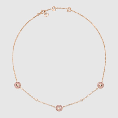 La nuova linea Gucci Interlocking presenta l'opale rosa, una pietra preziosa nota per le sue proprietà rilassanti. I nuovi modelli in oro rosa sfoggiano la gemma insieme ai diamanti bianchi, come questa collana a catena. Tre pietre accompagnano l'Incrocio GG, alternandosi con due diamanti scintillanti.