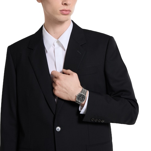 La nuova collezione GUCCI 25H presenta una silhouette essenziale, con elementi raffinati che valorizzano l'elegante design degli orologi. Questo accessorio, alimentato da un movimento al quarzo, è definito da un bracciale intercambiabile in acciaio e una cassa in acciaio inox con quadrante nero.