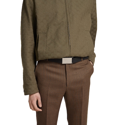 Le cinture da uomo includono modelli con fibbia a placca squadrata con logo Gucci inciso che aggiunge un tocco delicato. Qui, è proposta su una cintura in pelle liscia opaca.