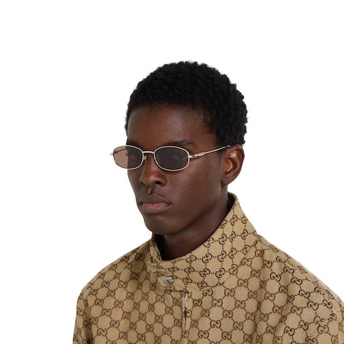 La collezione di occhiali Pre-Fall 2025 reinterpreta con un tocco contemporaneo silhouette d'archivio dal design di grande impatto. Questi occhiali da sole dalla forma ovale sfoggiano una montatura in metallo color oro chiaro impreziosita dal logo Gucci in versione cut-out.