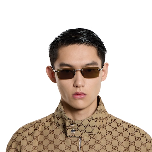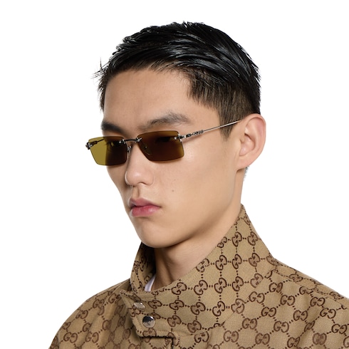 La collezione di occhiali Pre-Fall 2025 reinterpreta con un tocco contemporaneo silhouette d'archivio dal design di grande impatto. Questi occhiali da sole dalla forma rettangolare sfoggiano una montatura in metallo color argento impreziosita dal logo Gucci in versione cut-out.