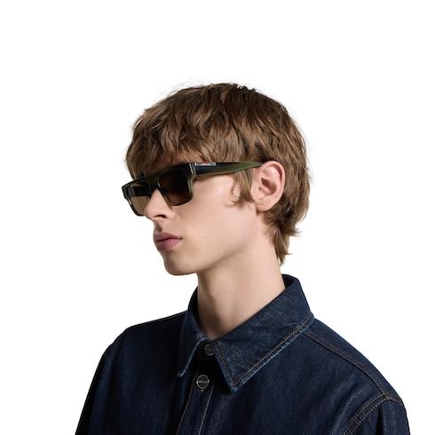 La collezione di occhiali Pre-Fall 2025 combina le silhouette ricercate dei decenni passati aggiungendo il logo per un tocco contemporaneo. Qui, la montatura in acetato tartarugato verde a righe è completata dal logo Gucci inciso su una placchetta in metallo.