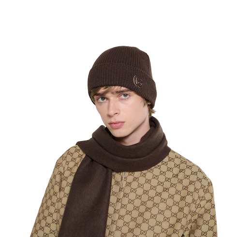 Nella collezione Pre-Fall 2025, gli accessori tessili e in seta aggiungono un tocco di vivacità ai codici della Maison attraverso finiture raffinate, patch con logo e ricami delicati. Questo cappello è realizzato in cashmere marrone scuro e arricchito da una patch in pelle Doppia G.