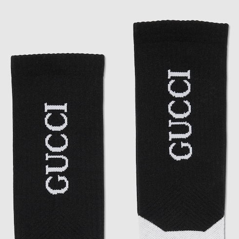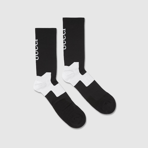 Gucci Altitude, la prima collezione di abbigliamento sportivo invernale della Maison, combina prestazioni elevate e codici distintivi. Realizzati in cotone nero e bianco, questi calzini presentano un logo Gucci ricamato.
