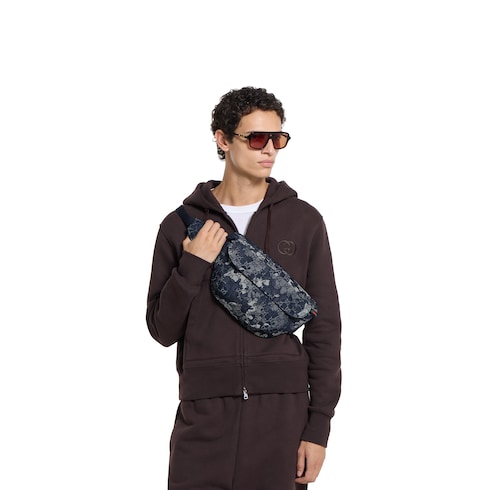 Nella collezione Autunno Inverno 2025, il denim GG si evolve in una nuova declinazione con effetto camouflage tono su tono, come su questo marsupio.
