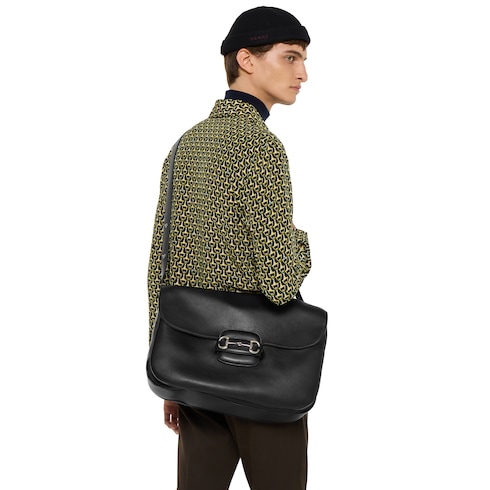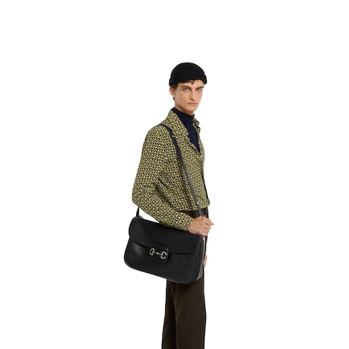 Parte della collezione Autunno Inverno 2025, la borsa a tracolla Gucci Horsebit 1955 misura grande incarna la maestria artigianale e l'attenzione della Maison ai dettagli. Il design a doppio anello con barretta, attinto al mondo equestre, è uno degli elementi più distintivi della Maison. Qui spicca su una base in pelle nera arricchita dal dettaglio mezzo Morsetto su entrambi i lati.