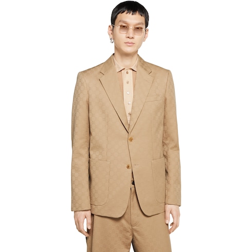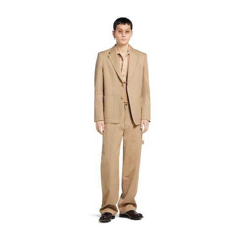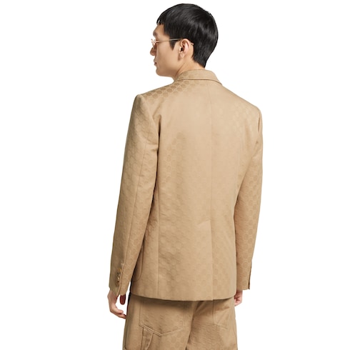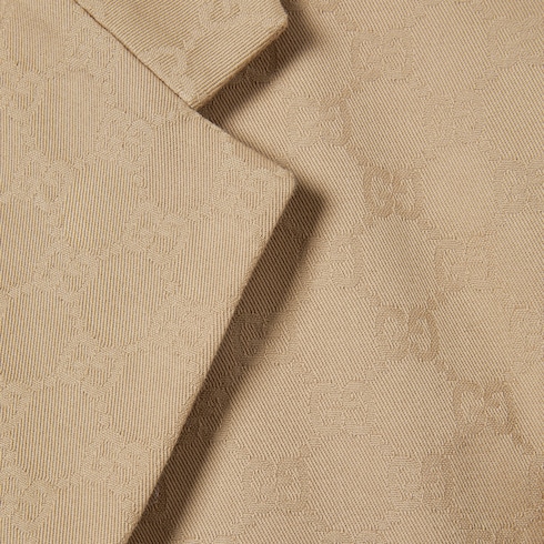 Per la collezione Pre-Fall 2025, un approccio all'abbigliamento formale ispirato alle influenze per il tempo libero e il leisurewear introduce nuovi tagli e nuove silhouette che combinano elementi esclusivi con dettagli raffinati. Questa giacca è realizzata in gabardina di cotone GG jacquard in colore beige chiaro.