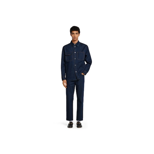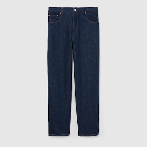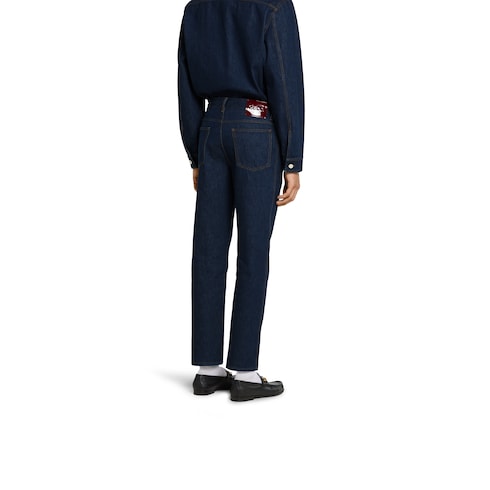 La collezione Pre-Fall 2025 presenta capi in denim contraddistinti da dettagli discreti che impreziosiscono i look di tutti i giorni. Questi pantaloni slim-fit in denim di cotone délavé blu scuro sfoggiano un dettaglio Web e un'etichetta in naplak Gucci Rosso Ancora.