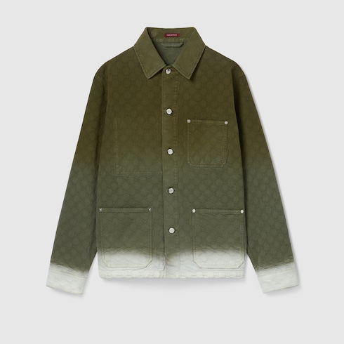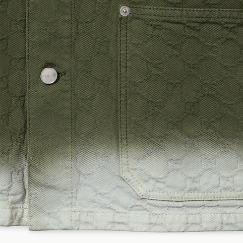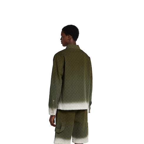 I colori sfumati creano uno splendido e studiato dégradé che valorizza la texture naturale dei materiali e l'inconfondibile motivo GG della Maison. Questa camicia è realizzata in denim di cotone GG jacquard con effetto bleached verde bosco e bianco sfumato.