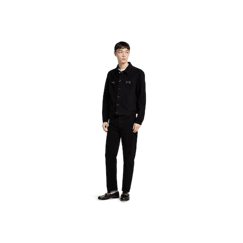 I capi della collezione Pre-Fall 2025 proposti in nuance tenui di nero, grigio e verde mettono in risalto delicati ricami floreali, loghi in rilievo e altri dettagli di fattura artigianale. Questa giacca, realizzata in denim di cotone nero, è impreziosita dal caratteristico Morsetto della Maison.