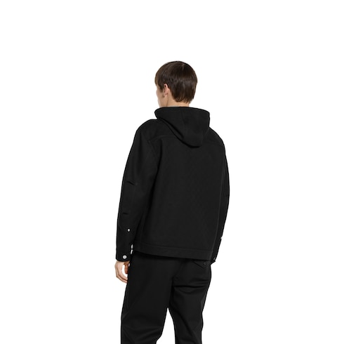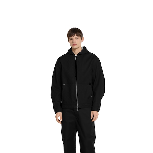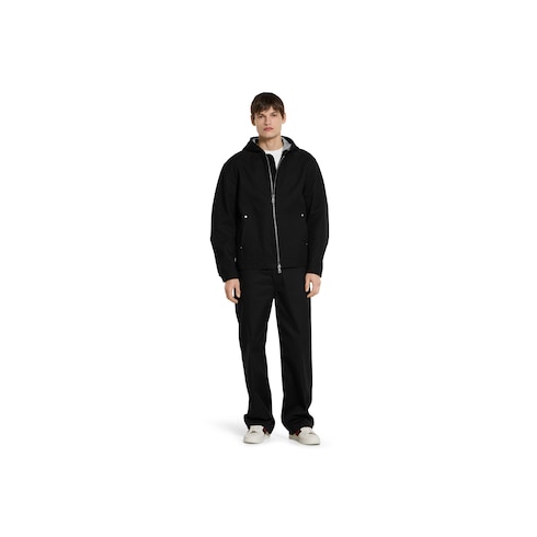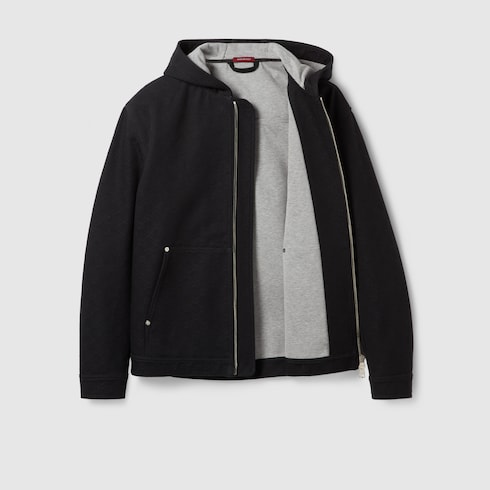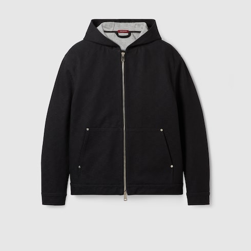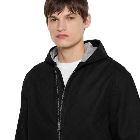 Per la collezione Pre-Fall 2025 i capispalla essenziali del guardaroba urbano, come bomber e giacche in pelle, sono proposti in materiali pregiati che combinano eleganza sofisticata e dettagli raffinati. Questa giacca con zip, realizzata in denim di cotone GG jacquard nero accoppiato con un morbido jersey di cotone, coniuga perfettamente struttura e comfort.