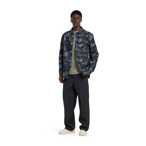 La collezione Pre-Fall 2025 presenta capi in denim contraddistinti da dettagli elaborati che impreziosiscono i look di tutti i giorni. Questa camicia, realizzata in denim GG jacquard effetto marmorizzato blu scuro e avorio, è rifinita con bottoni in metallo Gucci.