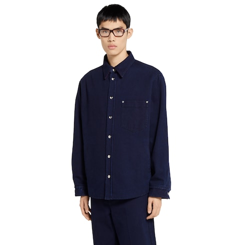 La collezione Pre-Fall 2025 presenta capi in denim contraddistinti da dettagli raffinati che impreziosiscono i look di tutti i giorni. Questa camicia, caratterizzata da una costruzione reversibile, è realizzata in denim délavé blu scuro da un lato e in flanella GG spazzolata rossa e blu dall'altro. Una discreta etichetta Gucci in rilievo completa il modello.