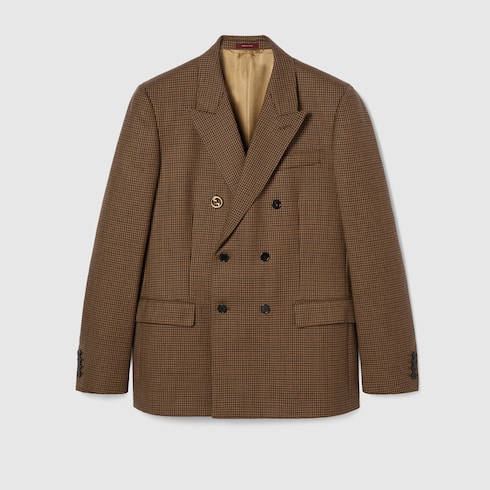 Abbinata ai dettagli tradizionali della Maison, una palette di tonalità autunnali definisce una selezione di capi dal taglio sartoriale. Realizzata in lana pied de poule beige e marrone scuro, questa giacca doppiopetto è impreziosita da un bottone Incrocio GG tondo.
