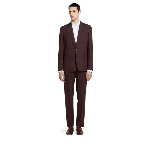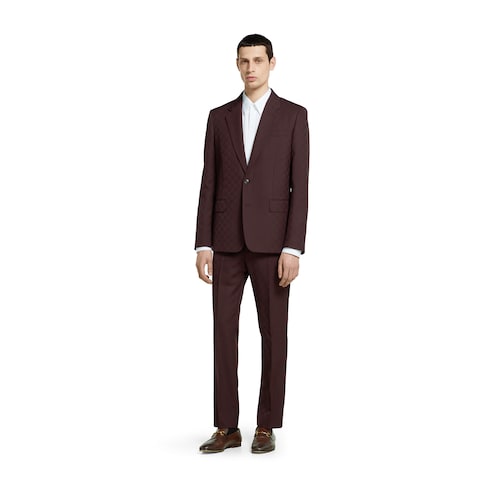 Per la collezione Pre-Fall 2025, un approccio all'abbigliamento formale ispirato alle influenze per il tempo libero e il leisurewear introduce nuovi tagli e nuove silhouette che combinano elementi esclusivi con dettagli raffinati. Questo abito è realizzato in jacquard di lana GG color bordeaux scuro.