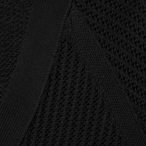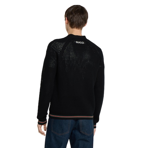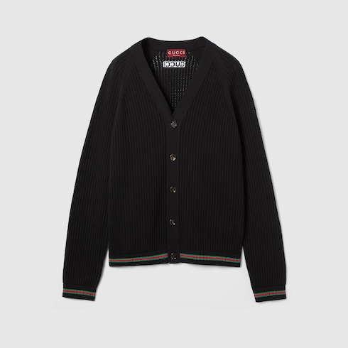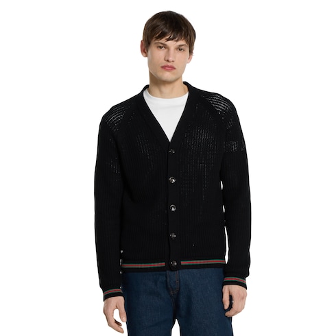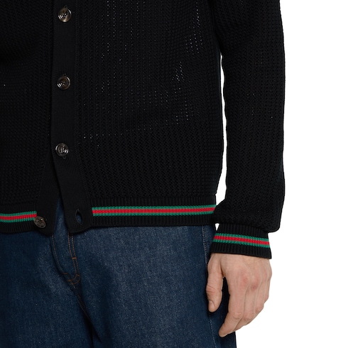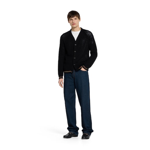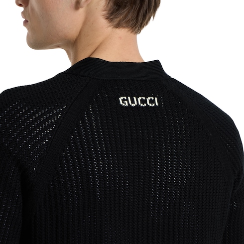 La collezione Pre-Fall 2025 mette in risalto silhouette essenziali con dettagli emblematici, dall'abbigliamento da giorno a quello da sera. Questo cardigan nero, realizzato in maglia di cotone, è impreziosito da un intarsio Gucci.