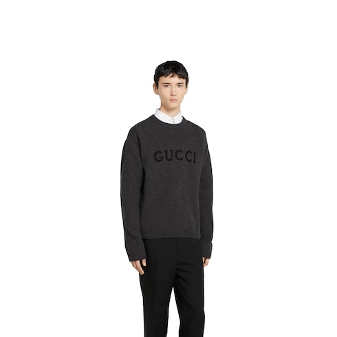 Alcuni dettagli storici della Maison impreziosiscono una selezione di capi ready-to-wear. Questo maglione grigio scuro e nero, realizzato in maglia di lana e cashmere a coste, è definito da un caratteristico intarsio Gucci.