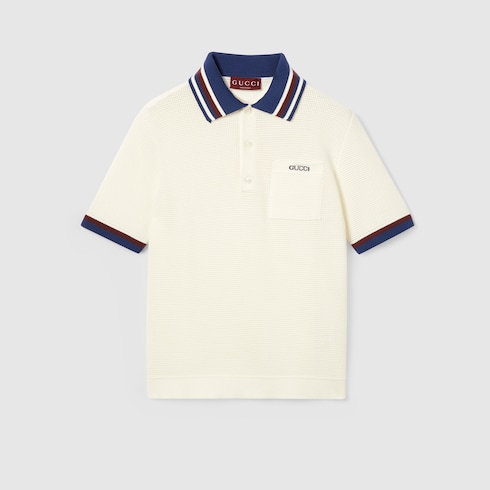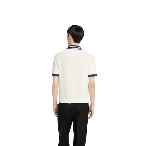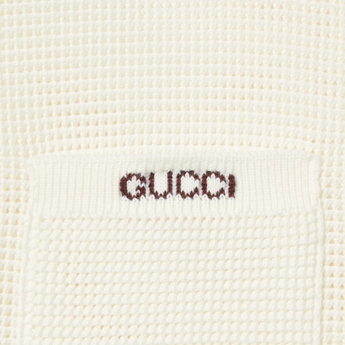 La collezione Pre-Fall 2025 mette in risalto silhouette essenziali con dettagli emblematici, dall'abbigliamento da giorno a quello da sera. Questa polo, realizzata in maglia di cotone punto piquet, è impreziosita da un intarsio Gucci.