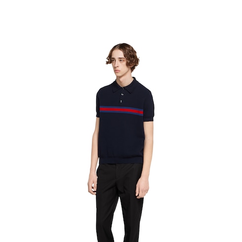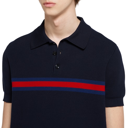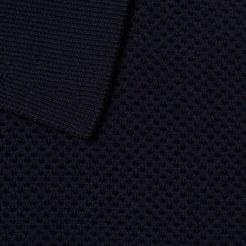 La Maison continua a esplorare il legame con il mondo del tennis, iniziato negli anni '70. Articoli esclusivi puntano su dettagli tradizionali, come il nastro Web, e su materiali innovativi. Questa polo blu navy, realizzata in maglia di cotone punto piquet, è definita da un dettaglio Web orizzontale.