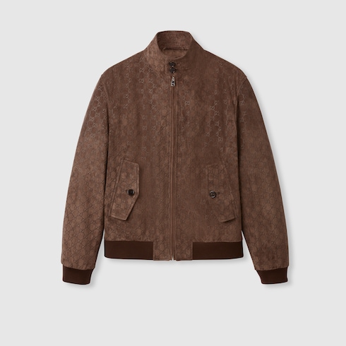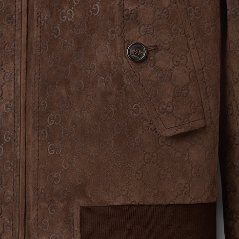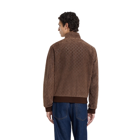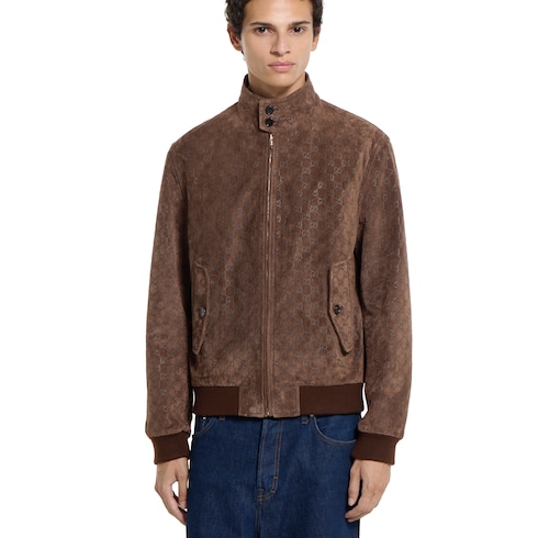 Per la collezione Pre-Fall 2025 i capispalla essenziali del guardaroba urbano, come bomber e giacche in pelle, sono proposti in materiali pregiati che combinano eleganza sofisticata e dettagli raffinati. Questo bomber è realizzato in pelle scamosciata GG in rilievo, qui nella variante colore marrone.