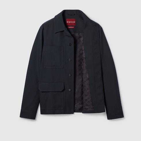 La collezione Pre-Fall 2025 combina alla perfezione texture versatili e dettagli sofisticati. Gli intrecci in jacquard e i ricami elaborati si evolvono per riflettere l'alternarsi delle stagioni. Questa giacca, realizzata in twill misto lana blu scuro, è impreziosita da un ricamo logo Gucci.